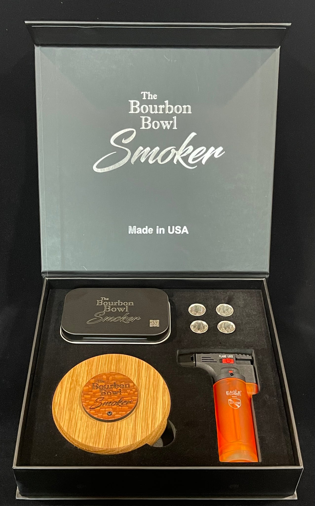 Thank you for taking a look at our NEW Bar top Gift Box Smoker, this package provides you with everything you need to create a quick and memorable unique Cocktail. Contents include our handmade and hand polished smoker, 4 additional screens, an Eagle Brand refillable butane torch, one metal tin of our proprietary special blend of wood and instructions for use.